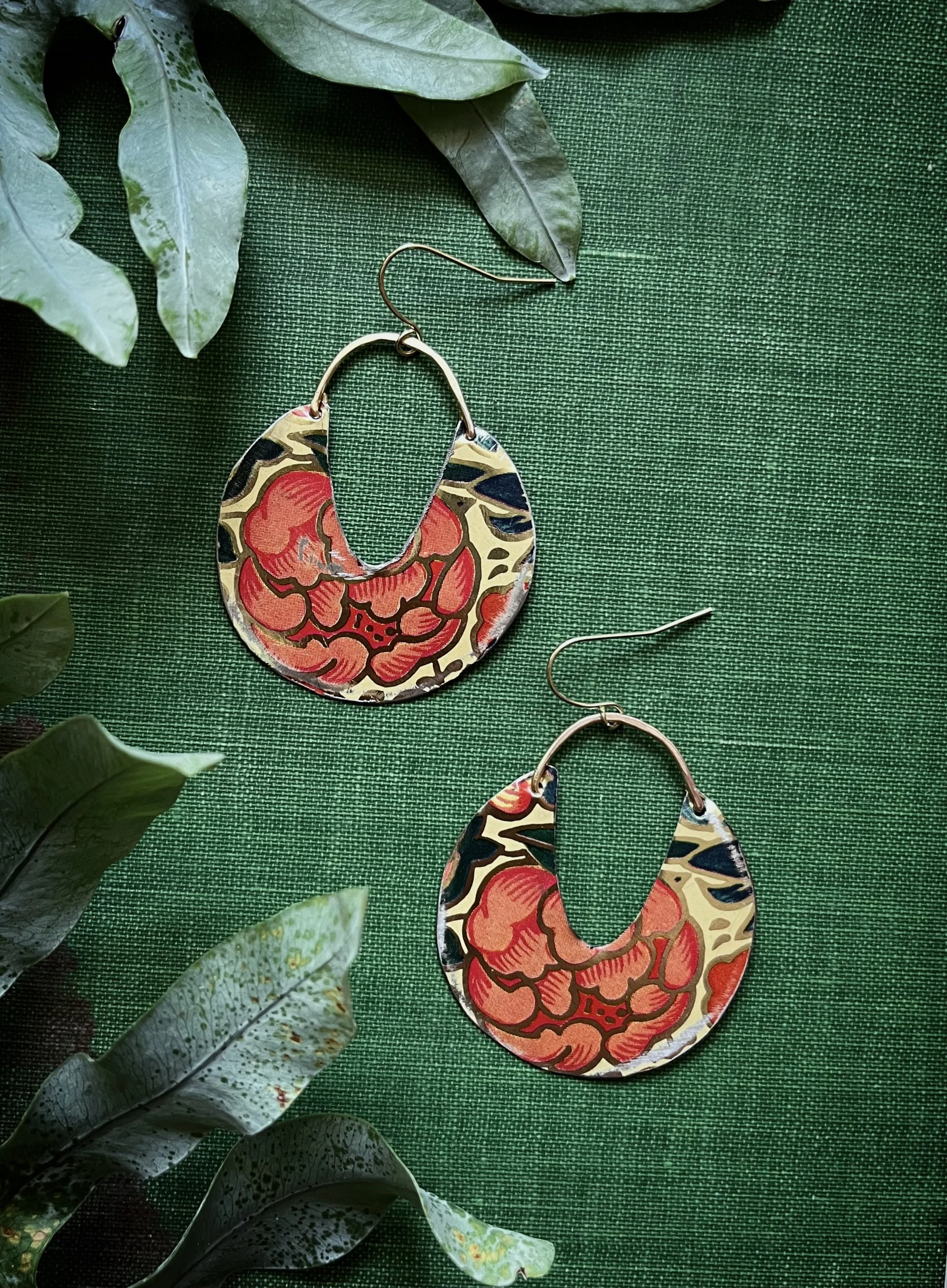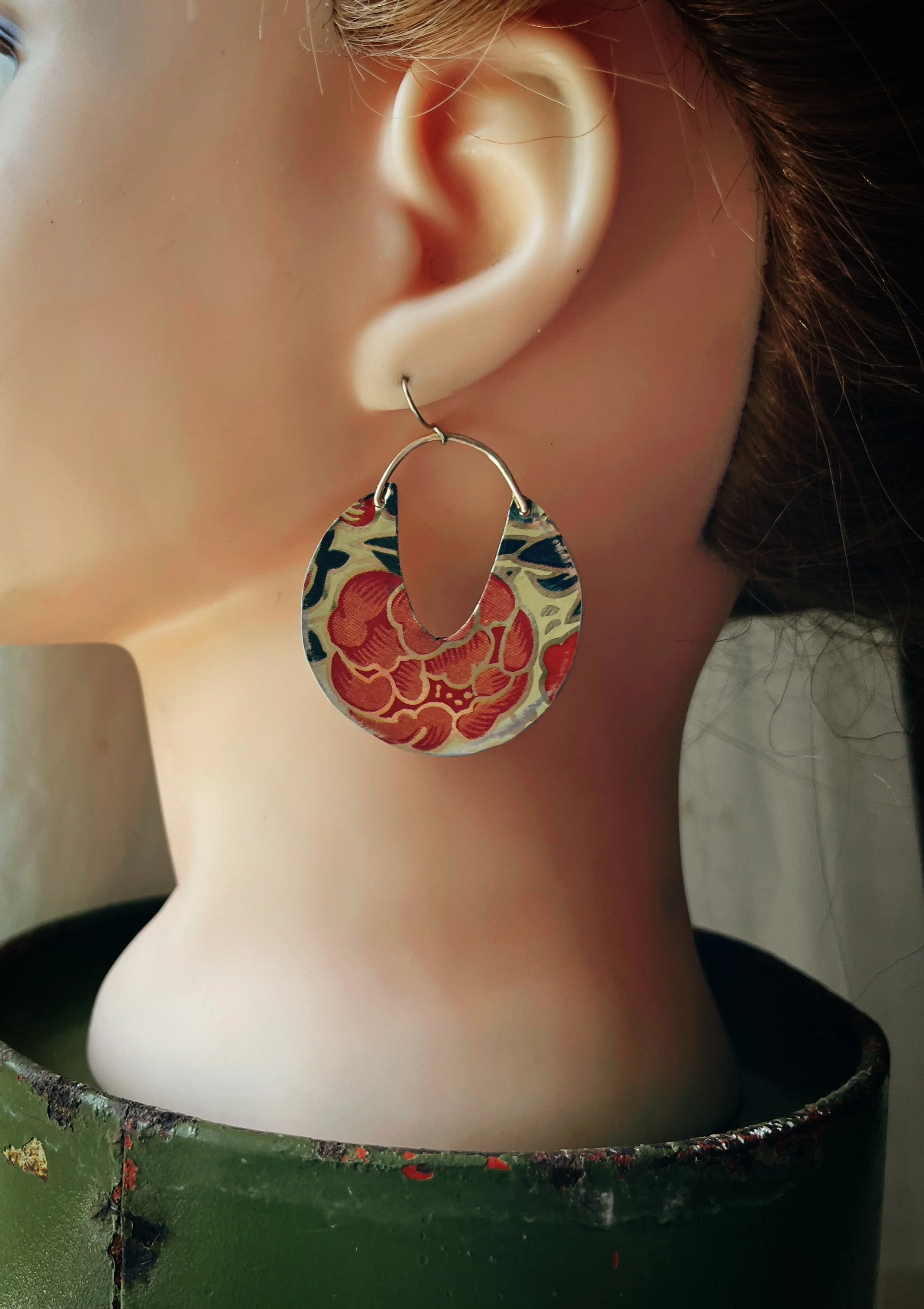 Beaitiful pattern on these ! Made from a very beautiful vintage tin box. Great statement earrings at the perfect size.Very light weight!