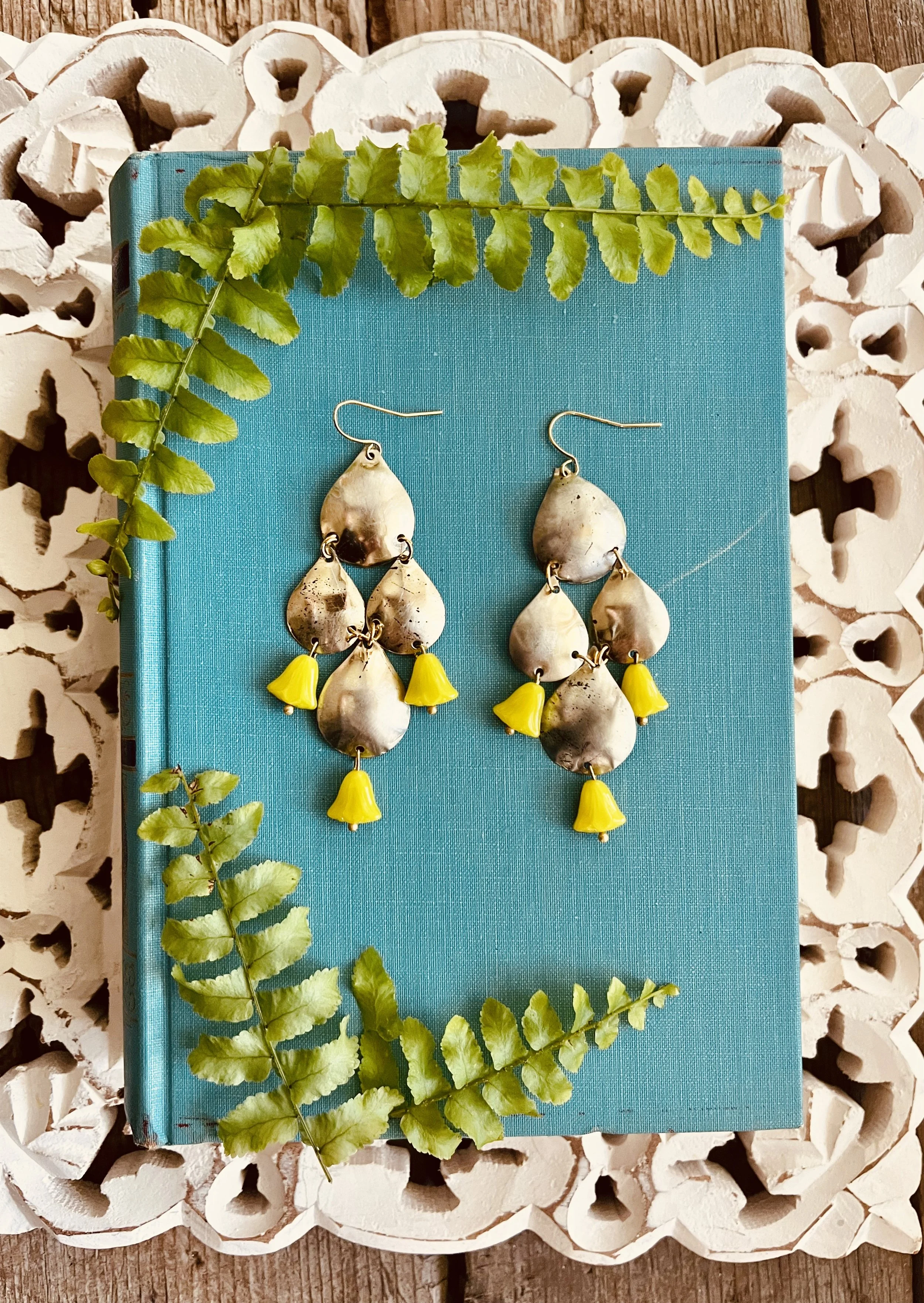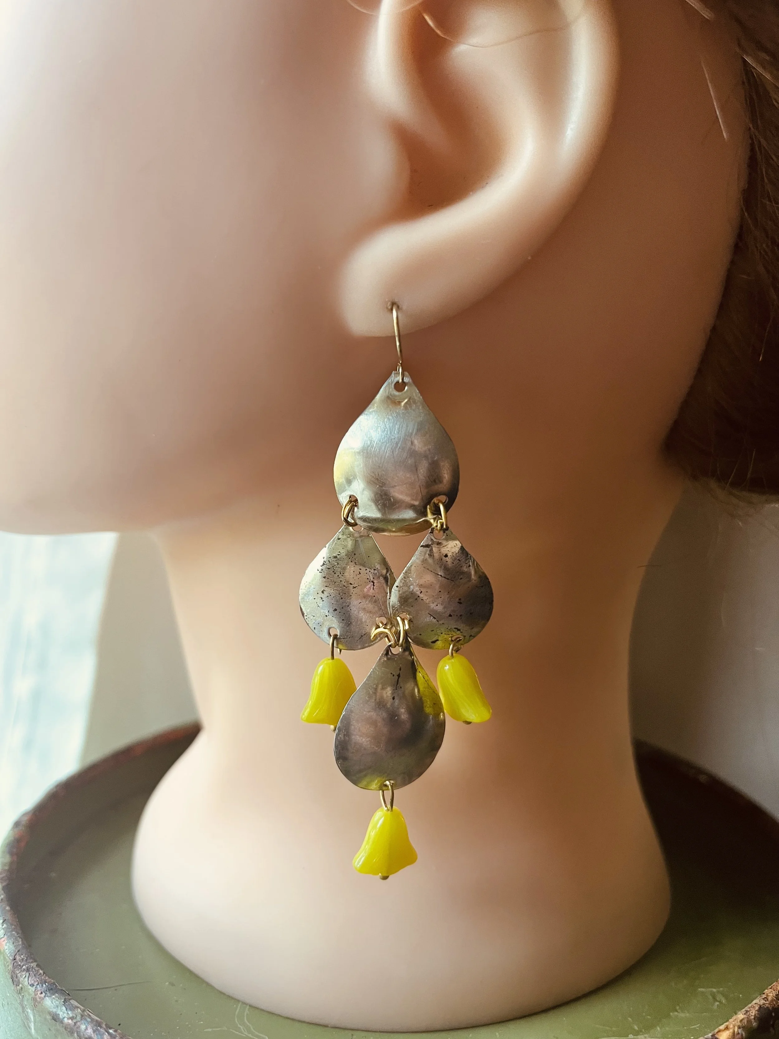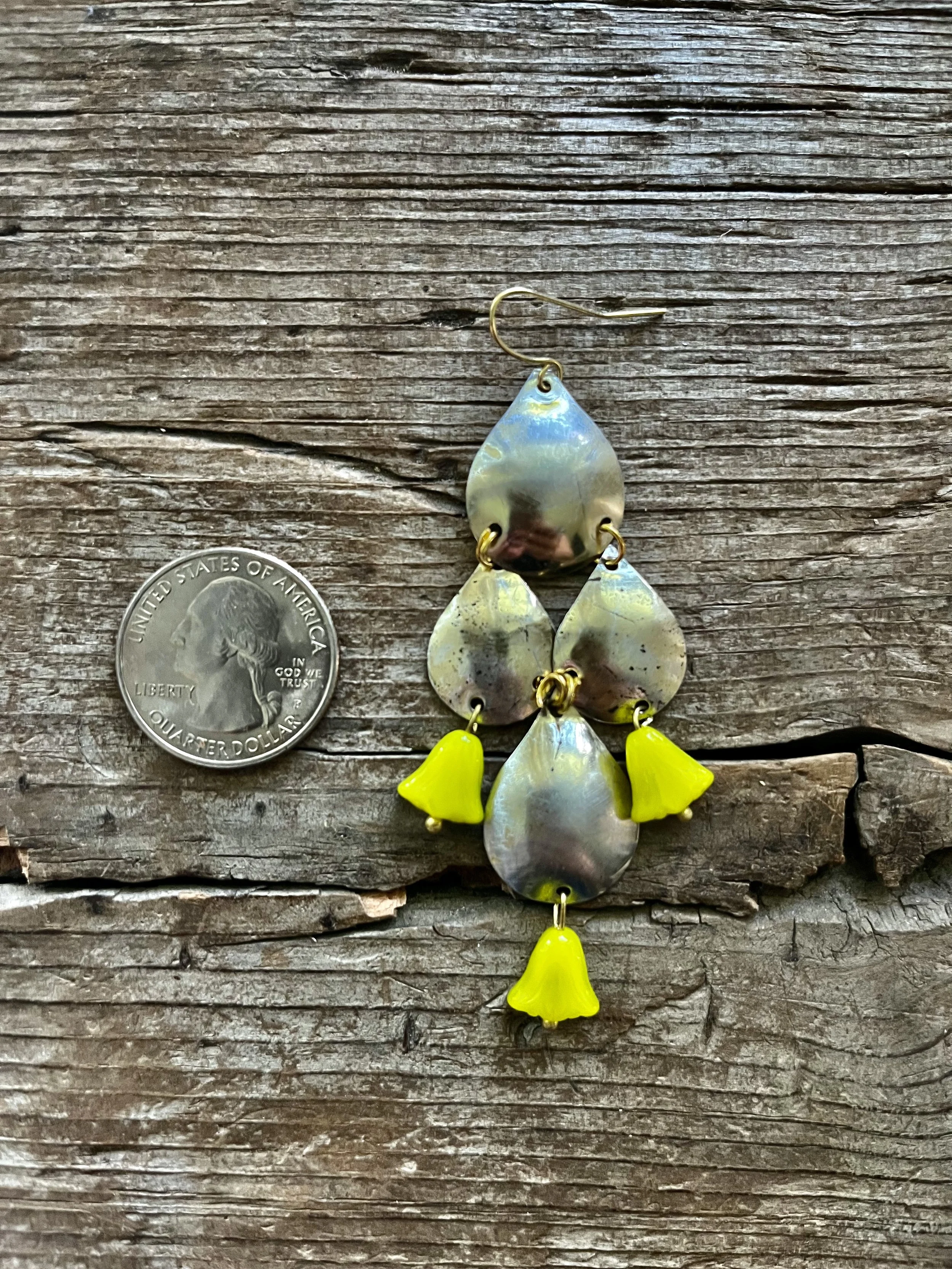 These are SO much fun! Beautiful and unique- Large but light weight.These have the look of sterling- paired with these beautiful Belgian glass chartreuse green beads.. SUCH a beautiful color! kind of neon!